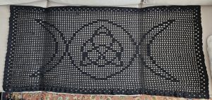 I love the way this came out so much that I actually started using it as a shawl instead of a decoration piece. I used a size 2 or 3 yarn and a smaller hook size ~3.5mm to create this piece. It drapes so nicely over the shoulders and is a great piece to have especially if you work closely with Selene or other Dieties closely connected to the moon.