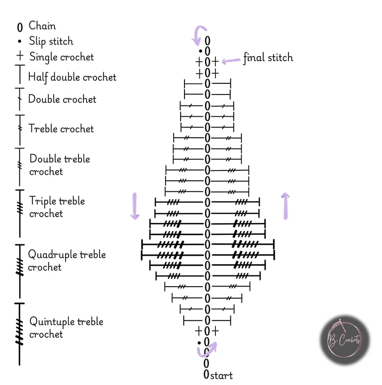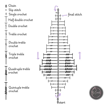 one single crochet (into the same chain as the last single crochet done on the first side), one half double crochet, one double crochet, one treble crochet, one double treble crochet, one triple treble crochet, one quadruple treble crochet, quintuple treble crochet (x2), quadruple treble crochet (x2), triple treble crochet (x2), double treble crochet (x3), half double crochet (x2), single crochet (x2)
